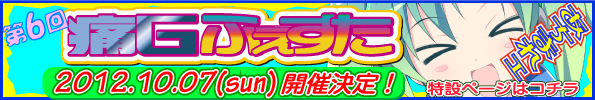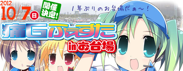 2012/8/8 19:00〜 エントリー開始しますた♪ http://www.geibunsha.co.jp/mook/ita/festa_p6/ 今回で痛Gも6回目!! チームボカロで並べてハッテン♂しないイカ?www ということでトピ立て致しました....〆(`・ω・´*)カキカキ ★日時 : 2012年10月7日(日) 9:30〜16:00 (雨天決行) ★会場 : 東京都・お台場レインボータウン(フジテレビ前) ☆新交通ゆりかもめ「船の科学館駅」 徒歩0分 ☆JRりんかい線「東京テレポート駅」 徒歩5分 ★一般見学入場料 : 1,000円