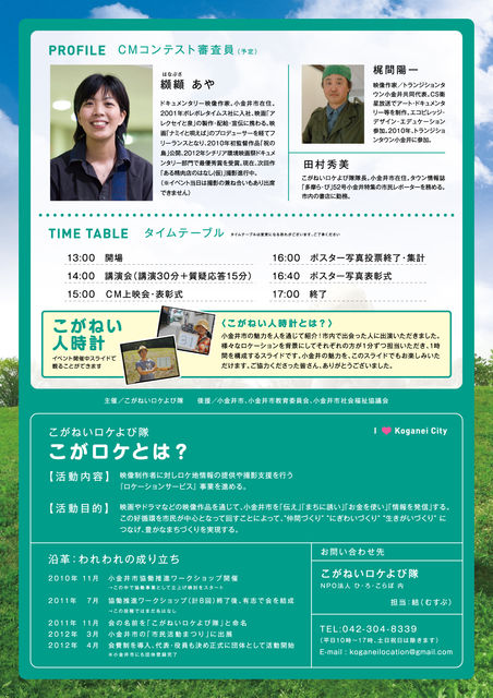 管理人様失礼いたします。 10月8日(月・祝)に「小金井が好きだ。」CM&ポスター写真コンテスト 展示・表彰イベントを開催いたします。 小金井市民交流センター(市民ギャラリー)にて応募作品の展示&上映、表彰イベントを開催します。 ※中央線・武蔵小金井駅前ホール (アクセス) http://koganei-civic-center.jp/access/access.html 【イベント内容】 ▼応募写真のポスター展示 ▼応募CM上映 ▼講演会:NPO日野映像支援隊 中川節子氏 ▼コンテスト表彰式 ※ポスター写真コンテストは来場者の皆さまに投票して
