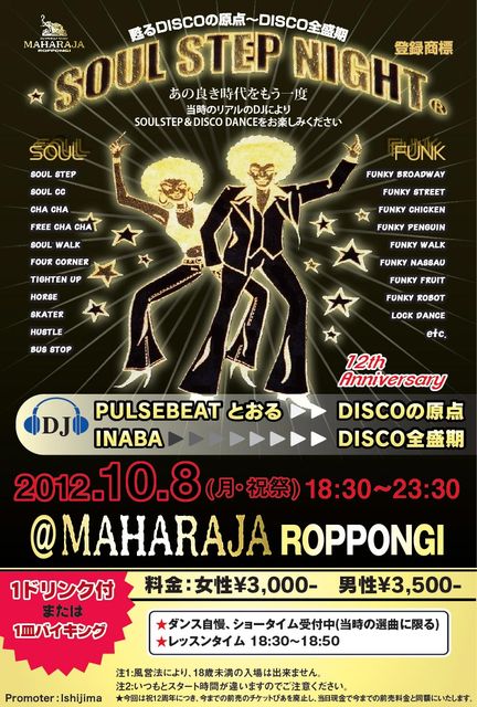 管理人様告知宜しくお願い申し上げます。 皆様前回は真夏の湘南DISCO NIGHT盛り上げてくださいましてありがとうございました 今回★SOUL STEP NIGHT(登録商標) 皆様のおかげをもちまして12周年を 六本木の名店MAHARAJAで開催しますので 是非遊びに来てください あの良き時代をもう一度 甦るDISCOの原点〜DISCO全盛期 ★SOUL STEP NIGHT祝12周年記念 [日時] 10/8(月曜祭日)18:30〜23:30 レッスンタイム18:30〜18:50 DJタイム18:50〜23:30