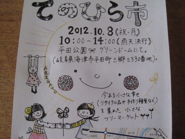 いつも ありがとうございます!!!! おかげさまで、第二回目の開催になります★ お千代保稲荷神社の近くにある平田公園のグリーンドームにて、 リサイクル品とハンドメイド雑貨のミックスのフリマを開催します(*^_^*) 全30ブースほどが 集まって下さる予定です☆ **************************************************************** ●てのひら市● 2012年10月8日(月曜・祝日) 10時から14時まで。(雨天決行) 場所 平田公園のグリーンドーム(岐阜県海津市平田町三郷2330番地) 今、手の中にある幸せ(リサイクル品