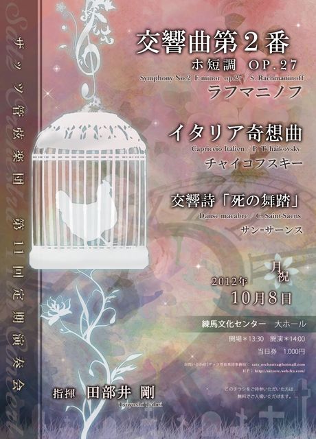 ザッツ管弦楽団第11回定期演奏会 スペースお借りいたします。演奏会のお知らせです。 ★2012年10月8日(月祝) ★13:30開場 14:00開演 ★練馬文化センター 大ホール *交響詩「死の舞踏」:サン=サーンス *イタリア奇想曲:チャイコフスキー *交響曲第2番ホ短調 作品27:ラフマニノフ *指揮:田部井剛 *当日券:1,000円 *[10月1日まで]チケットの無料プレゼントあります★ 詳しくはHPをご覧ください! http://satzorc.web.fc2.com/ 皆様のご来場を心よりお待ち申しております。