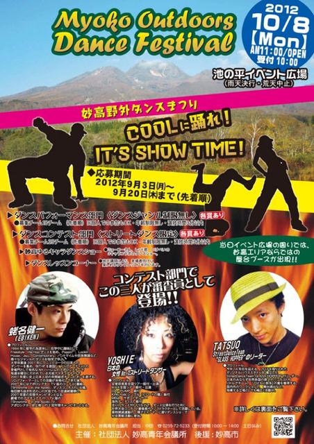 書き込み失礼いたいます☆ 10月8日(月・祝)に妙高の池ノ平で大きなダンスイベントがあります! 熱いイベントになること間違いなしです!! 是非、出演、出場をご検討ください☆ よろしくお願いします! タイムテーブルは 10時受付開始 11時〜開会式 11時10分〜パフォーマンス部門開始 13時30分〜コンテスト部門開始 15時半〜表彰式 審査員は YOSHIE(Be-Bop Crew) TATSUO(GLASS HOPPER) 蛯名健一(EBIKEN) 以上、豪華な方々に来て頂けることになりました。 なかなか、このメンツは揃わないと思います。 申し込みが