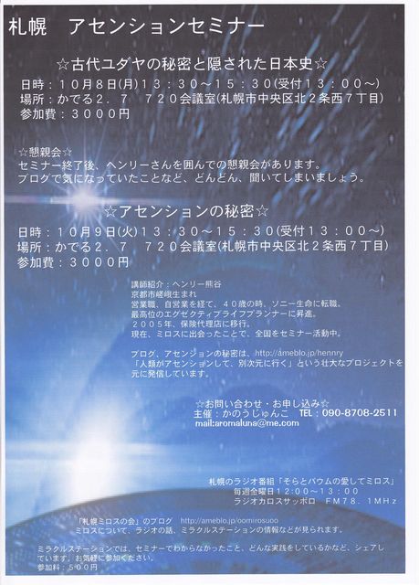 告知させていただきます♪ ☆古代ユダヤの秘密と隠された日本史☆ 今回はリクエストにお答えして、日本の本当の歴史について、語っていただきます たくさんのリクエストがあれば、名古屋や広島で行なわれている、裏の日本史を紐解く連続セミナーも夢ではありません ヘンリーさんのブログを読んでいる、北海道の皆様。 もう、そろそろ、出てきませんか?時間ですよ 参加費:3000円 ☆お問い合わせ・お申し込み☆ 主催:かのうじゅんこ TEL:090-8708-2511 mail:aromaluna@me.com