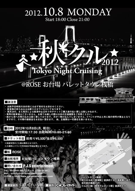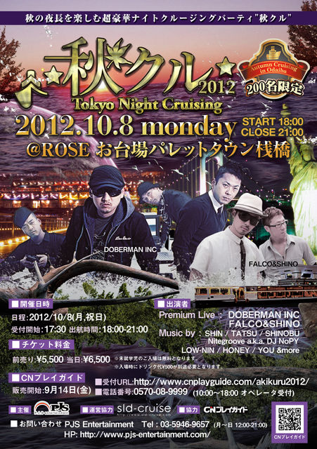 告知失礼致します。 10/8(月,祝日) 18:00-21:00 「DOBERMAN INC」出演イベントのお知らせです。 200名限定のクルージングパーティのため、ご希望の方はお早めにご予約をお願い致します。 ◆チケット購入をご希望の方は是非お気軽にメッセージを下さい☆ 詳細メールをお送りします!! ◆もしくは下記からでもご購入頂けます☆ 〜CNプレイガイドで絶賛発売中!〜 チケット予約はコチラから↓ http://www.cnplayguide.com/evt/evtdtl.aspx?ecd=CNK55673 ----------------------------------------------- ★お台場発、東京