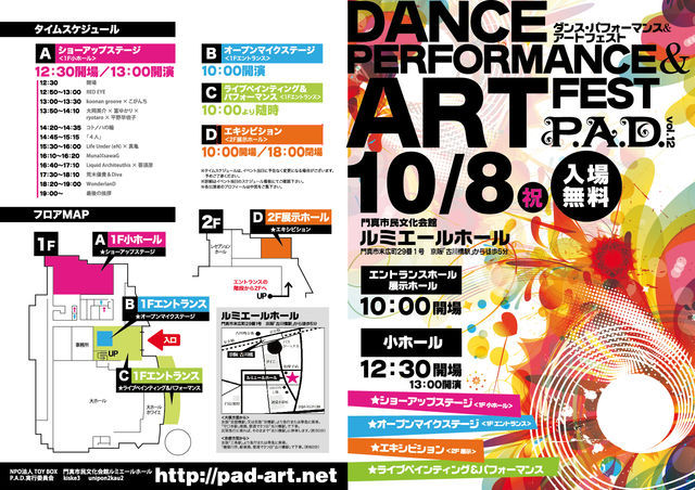 『ダンス・パフォーマンス&アートフェス P.A.D.12』 <日時> 10月8日(月)12:00〜19:00/アートイベント エントランス・展示ホール 10時開場 小ホール 12時30分開場 13時開演 <入場> 無料 <場所> 大阪/門真市民文化会館 ルミエールホール 〒571-0030 門真市末広町29番1号 TEL.06-6908-5300 ☆ルミエールホール http://kadoma.npotoybox.jp/lumi.html ☆Artevent[P.A.D.] http://mixi.jp/view_community.pl?id=4371242 《内容》 古川橋駅周辺で「古川橋ラブリーフェスタ2012」という「大阪 ミュージアム