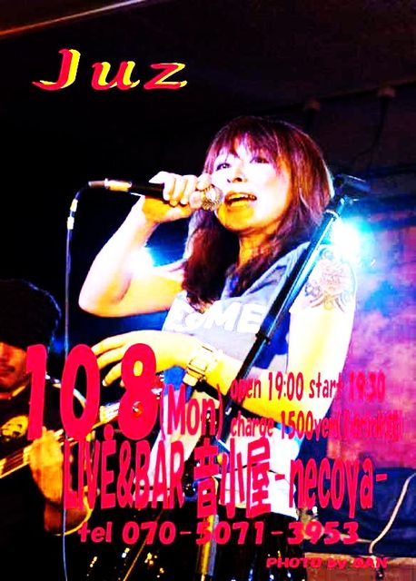 リアル女ロッカー【Juz】が再び来襲 今年3月の【WOMAN ISM Vol.3】では、その存在感に度肝を抜かれた! そして再びリニューアルオープン一周年を向かえた【LIVE&BAR音小屋necoya】で新たな伝説のライヴを繰り広げるであろう… バックには… 【Sputnik kombinat】からWakizawa(Ba.) 【ORANGE SUNSHINE】第二期メンバーである彼の旋律のベーステクニックは目を見張るものがある 【ORANGE SUNSHINE】からHASE(Gu.) 『オレサンとは違った俺を見に来てくれよWakizawaとやってた頃のオレサンの頃みたいにガンガンにRockするからガンガン