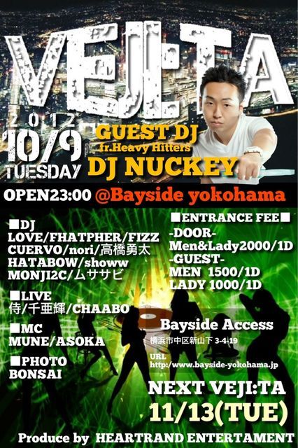 管理人様告知失礼致します 不適切であれば削除をお願いたします☆ エントランスで『べジータ』のGUESTと言って頂ければどなたでもでGUEST料金でご招待させて頂きます 毎月第2火曜日、横浜平日No.1PARTY毎月多数の方々が遊びに来てくれるPARTY・・ 【Veji:ta(ベジータ)】 ■GUEST 今回はあの世界一のDJチームHeavy Hittersから『DJ NUCKEY』が登場!! ■10月09日(火)毎月第2火曜日の横浜BAYSIDEにて開催 今回はVEJI:TAでの評判