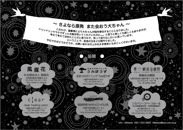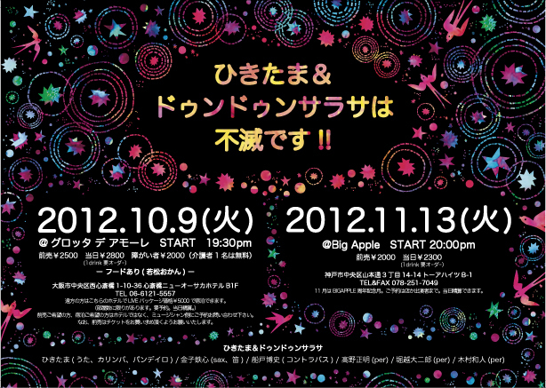 ひきたま&ドゥンドゥンサラサは不滅です 〜さよなら原発 また会おう大ちゃん このたび、諸事情により大ちゃんがバリに移住することになりました。 ドゥンドゥンサラサでずっと太鼓を叩いてくれていたのに。。。と思うと悲しくも寂しくもありますが、考えて考えて決めたことだと思うので、笑って送り出したいと思っています。 ということで、記念の日を2日間作りました。平日ですがどうかどうか、万障お繰り合わせの上みなさまお誘い合わせて是非ともおこしくださいませ。 10/9(火)19:30~ グロッタ デ アモーレ 前売¥250