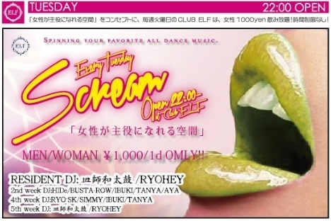 管理人者様、告知失礼致します。 業界大注目!最先端PARTY! 火曜日はSCREAM at CLUB ELF開催! 「女性が主役になれる空間」をコンセプトに、 火曜日のCLUB ELFは、男女1000yenで1ドリンク付き! 音楽は、最先端エレクトロから、ビルボードTOP40、ストリートヒット、パーティーには欠かせない名曲まで、あなたのお気に入りの曲をスピン! 高いヒールでも安心!レディース専用シート完備! 音楽、お酒、出会いをオシャレに楽しんじゃおう! ★☆★☆★☆★☆★☆★☆★☆★☆★☆★☆★☆★☆★ ゲストお取り出
