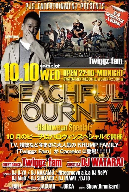 管理人様、告知失礼致します。 ☆☆毎月第2水曜日開催「ピーチフルジャーニー」☆☆ 『10/10(水)ピーチ-ハロウィンスペシャル開催』 GUESTにはTV,雑誌など今まさに大人気のKRUMP FAMILY 「Twiggz Fam」がCamelotに初登場!!!衝撃のパフォーマンスは必見です。勿論、GUEST DJではお馴染「DJ WATARAI」やPEACH DJ‘Sが今Hotな新譜、旧譜やこれから流行する最新曲などでフロアーを盛り上げます。皆様を幸福な旅=[PEACHFUL JOURNEY]へご案内いたします! ★☆★☆★☆★ ゲストお取り出来ますので、お気軽にご連絡下さい☆ また、エント