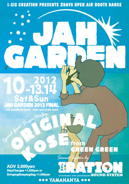 今週末は今年最後の"J A H G A R D E N" ゲストは"ORIGINAL KOSE"(from GREEN GREEN)!! with "ERIKA CRYMSON"& "TACO"& "空花" 3名の女性シンガーとのコラボレーションも魅せてくれます!! 最高の時間を満喫しましょう!! 2012−10−13&14(Sat&Sun) I-SIS CREATION PRESENTS "J A H G A R D E N" 〜2DAYS OPEN AIR ROOTS DANCE〜 ★2012年最後のJAH GARDENです★ in 山なんや ※雨天決行 http://yamananya.jimdo.com/ -Special Guest Singer/