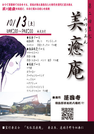 おはようございます。 本日 第2回笠松 美癒庵〜みゆうあん〜イベント 開催です。 美と癒しのブースがいっぱい 飲食ブースも充実 ハンドメイドの販売もステキなのがいっぱい 羽島郡笠松町八幡町91 蓮国寺にて 9:00〜15:00 無料駐車場あります。 詳しくはコチラご覧ください。 http://ameblo.jp/gifu-artisan/entry-11378261192.html ゆっくり まわっていただけるように 休憩所も設けてあります。 おひとりでも ご家族でも お友達とでも みなさんに楽しんでいただけ