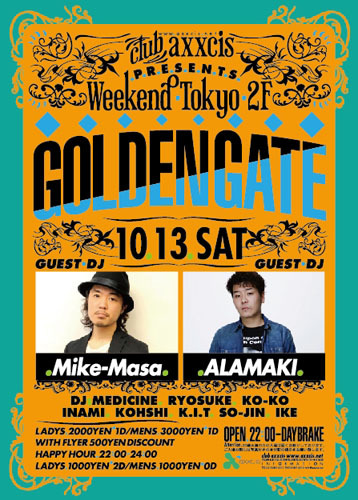 ☆★☆★☆★☆★☆★☆ 10/13(土)axxcisエントランスで、 【リョウスケのゲストでゴールデン】 と言って頂ければどなた様もお得なゲスト料金でご案内致します ※ディスカウント料金 12時まで→女性\1000/2d 男性\1000/no 12時以降→男女共\1500/1D ※個別のゲストもお取りできますので希望される方は気軽にメッセージください ☆★☆★☆★☆★☆★☆★☆ 『GOLDEN GATE』 @axxcis :OPEN 22:00〜 :DJ ・MIKE-MASA ・ALAMAKI 10/13(土)axxcisエントランスで、【リョウスケのゲストでゴール