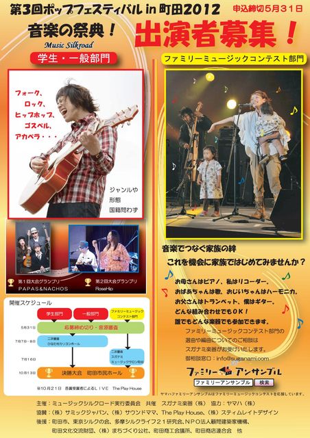 「第3回ポップフェスティバル in 町田 2012」 いよいよ、第1次審査の応募要項がきまったよ〜。 音たま後援のミュージックシルクロードのメインイベントなんだ。 詳細、応募用紙もこちらで〜。 http://music-silkroad.jpn.org/popfes3.html 大きなステージで演奏するチャンス スタッフも随意募集中〜だそう。 行きつけのライブハウスやスタジオに チラシを置いてくださるようにお願いできる方もご連絡ください。とのこと。 感想も。。。