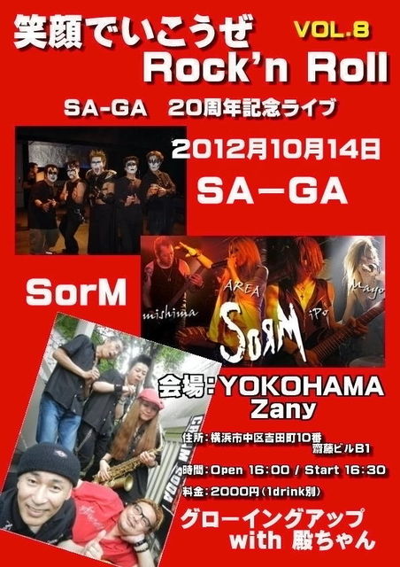 2012.10.14(日) 笑顔でいこうぜ Rock'n Roll VOL.8 『SA−GA 20周年記念ライブ』 会場:YOKOHAMA 『Zany』 H.P:http://livehouse-zany.com/ 住所:横浜市中区吉田町10番 齋藤ビルB1 電話:045‐334-7890 時間:OPEN 16:00 / START 16:30 料金:2000円(1drink別) 出演 ◆SA−GA(ザジ所属) ◆SorM(ハヤオ・Mayo・iPo所属) http://sorm-web.net/ ◆グローイングアップ with 殿ちゃん http://www.tono1966.com/tono/gu.html ◆DJ:TAI−C(黒聖母