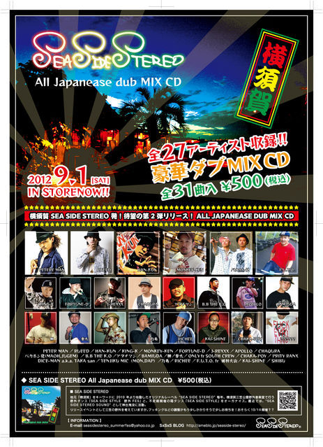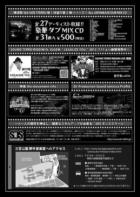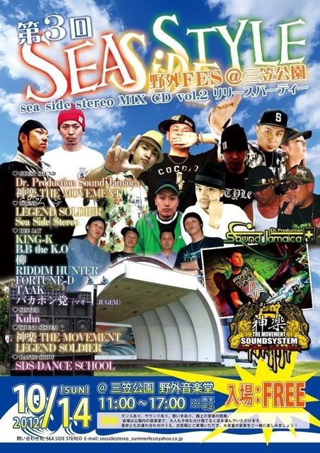 2K12・10・14(日) 横須賀の三笠公園が熱いっすよ!! 今年で3回目になる秋の野外FES!! 今年も熱いメンツでお届します!! 第3回 SEA SIDE STYLE 野外FES @三笠公園野外音楽堂 〜SEA SIDE STEREO vol.2 MIXCD リリースParty〜 もちろん入場は無料!! 必ず遊びに来てください!!笑 ■GUEST SOUND >>Dr Production Sound JAMAICA / 神楽 the MOVEMENT ■SOUND >>LEGEND SOLDIER / Sea Side Stereo ■DEE JAY >> KING-K / B.B the K.O / 柳 / RIDDIM HUNTER / FORTUNE-D / TAAK / バカ