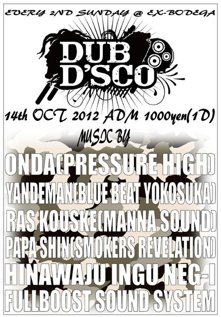 Every 2nd Sunday@ex Bodega DUB D'SCO 2012.10/14(sun) ADM:1000yen(1D付き) MUSIC BY ONDA(PRESSURE HIGH) YANDEMAN(港南Hi-Fi) RAS KOUSKE(MANNA SOUND) HINAWAJU INGU NEG-I PAPA SHIN FULLBOOST SOUND SYSTEM
