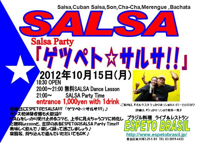 ☆2012/10/15(月)SALSA PARTY『ゲツぺト☆サルサ』 月曜日に!! エスペト・ブラジルで!! サルサ!! 『 ゲツぺト☆サルサ!! 』ますます大好評!! ☆『無料サルサ・ダンス・レッスン』は、 美味しく飲んで、楽しく陽気に気軽に楽しくサルサ・ダンス・レッスン♪ 初体験さんも安心♪今夜からサルサ・ダンスが踊れちゃう♪ 『リズムをしっかりと感じるコツ♪&上手に見えちゃうコツ♪』 に特化したレッスン!! Salsa Club,Party,Live等々で楽しく踊りまくってきた Ukkari☆Sonのエイミー&ヒロカワが
