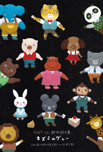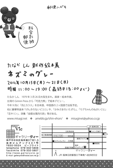 ●・○・●・○・●・○・●・○・●・○・●・○・●・○・●・○・●・○ 新作絵本展『ネズミのグレー』 2012年10月15日(月)〜21日(日) ・open 11:00〜19:00 *最終日18:00まで ●会場 ギャラリーヴィー 〒650-0024 神戸市中央区海岸通3丁目1-5海岸ビルヂング307号 tel:078-332-5808 www.galleryvie.jp ※JR・阪神元町駅西口下車南へ徒歩5分 ●・○・●・○・●・○・●・○・●・○・●・○・●・○・●・○・●・○ 今回は絵もお話も、いつもの作風よりもグンとかわいらしく ギュっと抱きしめたくなるよ