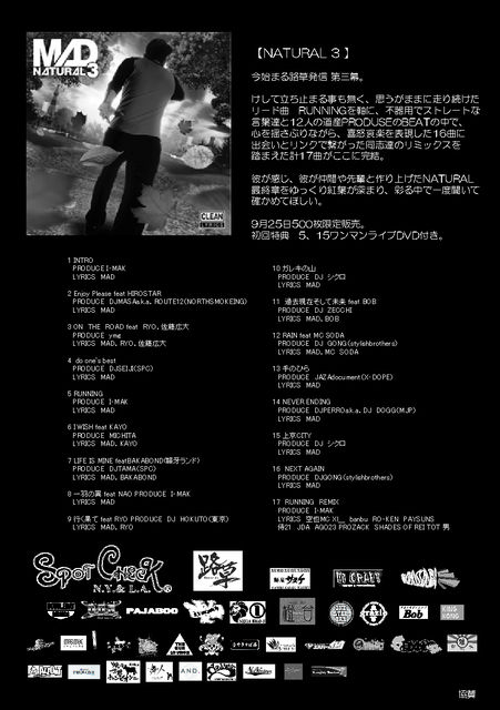 2ヶ月に一度開催してます音楽でSMILEをモットーに。 そして新しいリンクや出会い、発見が毎回生まれますイベント。 平日から、またあの歓喜と踊る楽しさを。 今回は何とMAD自身のアルバム 「NATURAL 3」のリリースイベントと なっております。 自身2度目のワンマンライブや、各土地で自分を高め続け、そしてどんな場面で あったとしても走り続けた男のSMILEでのライブは、仕事が遅く終わるあなたや 関係者に一つ今のMADの姿を見せる最高の時間となることでしょう。 是非、成長を止めず、加速するMADをご覧ください。 そして、そんなMADがリリ