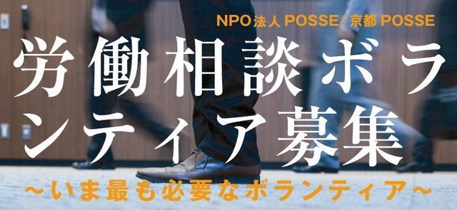 管理人様 告知失礼します 労働相談ボランティア募集!〜いま最も必要なボランティア〜 いま、「パワハラを受け、うつ病になってしまった」「退職を申し出たら損害賠償を請求すると脅され、辞めさせてもらえない」など、ブラック企業の悪質な違法行為によって病気になったり、働き続けられなくなって貧困に陥る若者が後を絶ちません。労働法が無視され、不安定な生活を送らざるを得ない人が増えている今こそ最も必要なボランティア、労働相談ボランティアをあなたもやってみませんか? NPO法人POSSE(ポッセ)は学生ボランティアスタッフ募
