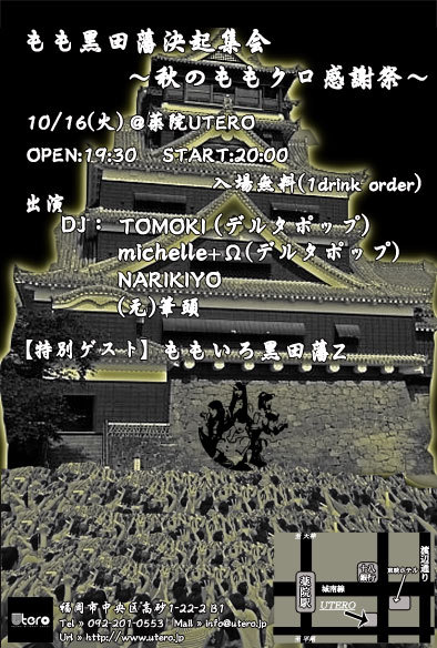 告知失礼します 福岡で、ももクロちゃんを軸にしたDJイベントをやります。 入場無料(1ドリンクオーダー)なので気軽に遊びに来て下さい。 食べ物の持ち込みならOKです。 服装自由! みんなで集まって大音量で、歌おう!踊ろう!笑おう!という趣旨です。 九州のモノノフ共よ集合せよ!!そして逆回転するのだ!!! 10/16(火)@薬院UTERO もも黒田藩決起集会 〜秋のももクロ感謝祭〜 開場19:30 開演20:00 終演 25:00 料金:入場無料+1D [DJ] michelle+Ω(デルタポップ)NARIKIYO、(元)筆頭、TOMOKI(デルタポップ)
