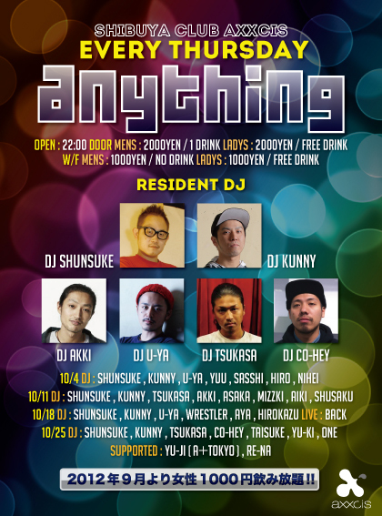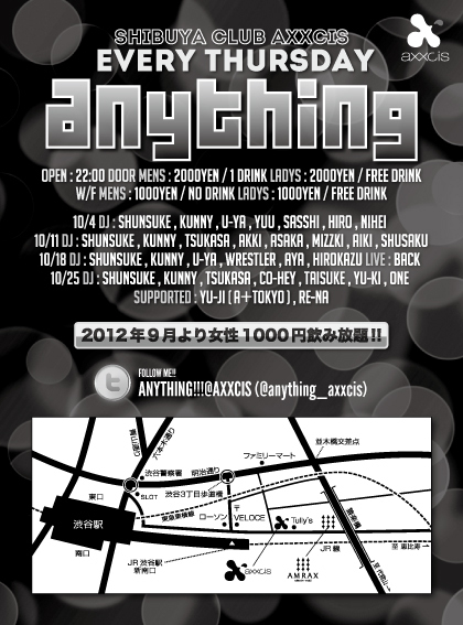 渋谷アクシスにて毎週木曜日開催の『 ANYTHING』 エントランスにて 『ゆうじのゲストでゆうじ』 女性/ 1000円飲み放題 男性/ 1000/0D にてご入場頂けます 質問、個別ゲスト等お気軽にメッセージどうぞ 詳細はコチラ ANYTHING@渋谷AXXCIS ~Every Thursday~ 毎