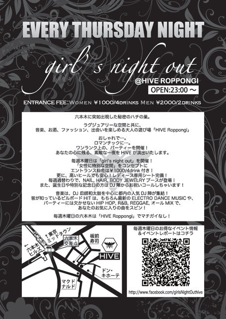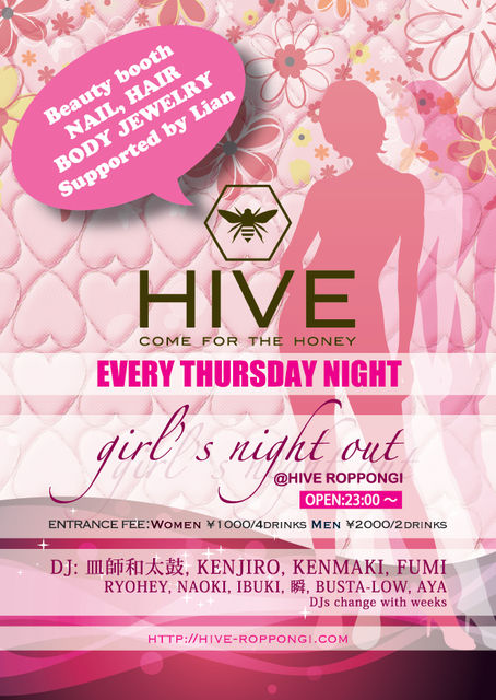 業界大注目!最先端PARTY 六本木に突如出現した秘密のハチの巣 ラグジュアリーな空間と共に、 音楽、お酒、ファッション、出会いを楽しめる大人の遊び場「HIVE Roppongi」 毎週木曜日は「girl's night out」を開催! 木曜日限定!お得な入場方法! 入り口で、受付スタッフに「FMSのゲストです