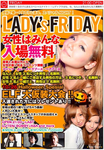 10月19日金曜日、21時オープン! 「LADY'S FRIDAY」@渋谷ELF ☆毎週金曜日開催中☆ http://www.youtube.com/watch?gl=JP&hl=ja&client=mv-google&v=A8qYOwoI3IA&feature=youtu.be&nomobile=1 エントランスにてご入場の際、 「カワグチのゲストでmixi」 と言っていただけたら、 女性は終日完全入場無料 男性は1500円1ドリンク にてご招待することが出来ます!! また個別ゲスト希望の方は、 タイトルに「10/19(金)ゲスト希望」 本文に『