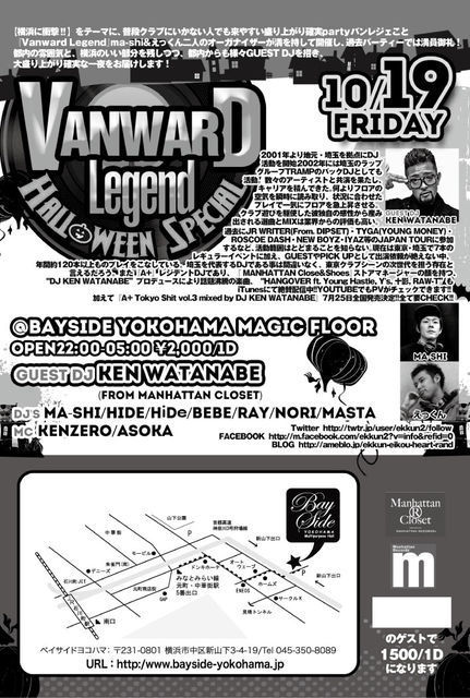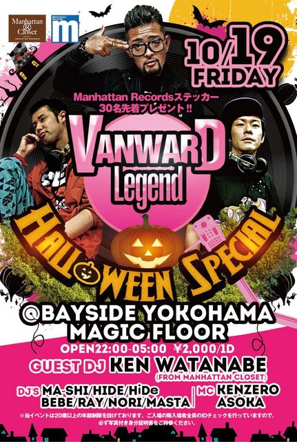 管理人様告知失礼します! 横浜 BAYSIDE YOKOHAMA にて! 新しいイベントがスタートします!o(^▽^)o ■イベント名 Vanward Legend 〜Halloween Special〜 ■日時:10月19日(金) ■場所:Bayside Yokohama Magic Floor ■時間:22:00〜05:00 ■料金 DOOR 2,000/1D GUEST 1,500/1D ■GUEST DJ KEN WATABE(Manhattan closet) ■DJ's ma-shi HIDE HiDe BEBE RAY nori MASTA ■MC KENZERO ASOKA Vanward Legendとは・・・ 【横浜に衝撃!!】 をテーマに、普段クラブにいかない人で