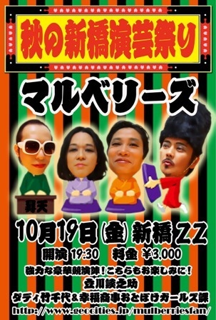 10/19(金) 『秋の新橋演芸祭り!』 【出演】 ダディ竹千代&幸福商事おとぼけガールズ課 マルベリーズ 立川談の助 場所:新橋ZZ http://www.zzpad.com/ 東京都港区新橋4−31−6−B1 tel:03-3433-7120 開場 19:00頃 /開演 19:30 予約/当日 3,000円 +ドリンク代500円〜 ご予約承っております。 キャンセル料はいただきませんのでお気軽にご予約ください。 ?ここのイベントに参加(当日の正午まで) ?名前と枚数を書き込む(当日の正午まで) ?まるぽんに名前と枚数をメッセージで送る(