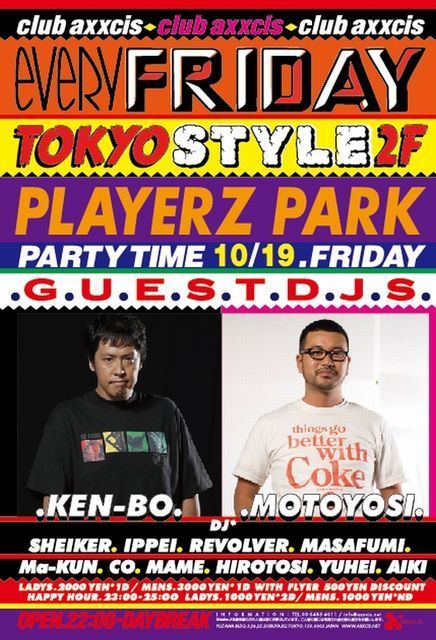 ★TOKYO STYLE@渋谷axxcis 10/19(金曜日) 18歳から入場可! 1時までゲスト料金で入場すると1000円でドリンクはほぼ300円 今晩は、club axxcis SHIBUYA毎週金曜日恒例満員御礼のBIG PARTY『PARTY HITS@TOKYO STYLE』 GUEST DJにはHARLEM等おなじみのDJ DJ KEN-BOにDJ MOTOYOSI そして、今若手で大注目のKAZCOZYと超豪華 毎月、800人以上動員し盛り上がってます2F〜4F行き来自由 ゲスト料金で入場すると1