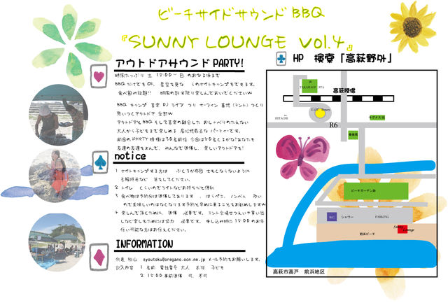 参加者もとみます☆ ビーチサイドサウンドBBQ 「SUNNY LOUNGE vol.4」 アウトドアを楽しもう! 2012.10.20(土) 15:00集合準備 〜 21(日)10時くらい?w 場所 たかはぎ 前浜(むかしのビーチガーデン前の海) 参加費3500円前後 食べ飲み放題 足りない場合追加 高校生2000円 子ども1500円 (未成年者は保護者同伴) 申し込みは メールにて syoutoku@oregano.ocn.ne.jp HP 検索「高萩野外」 -------☆ビーチサイドサウンドBBQ 「SUNNY LOUNGE vol.4」☆-------- ■大人数で