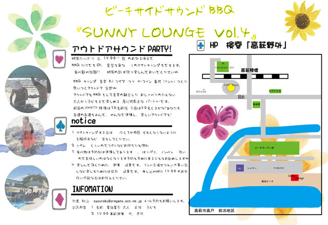 ビーチサイドサウンドBBQ 「SUNNY LOUNGE vol.4」 アウトドアを楽しもう! 2012.10.20(土) 15:00集合準備 〜 21(日)10時くらい?w 場所 たかはぎ 前浜(むかしのビーチガーデン前の海) 参加費3500円前後 食べ飲み放題 足りない場合追加 高校生2000円 子ども1500円 (未成年者は保護者同伴) 申し込みは メールにて syoutoku@oregano.ocn.ne.jp HP 検索「高萩野外」 -------☆ビーチサイドサウンドBBQ 「SUNNY LOUNGE vol.4」☆-------- ■大人数で行うアウトド