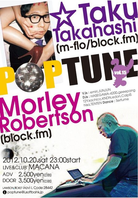 仙台に☆Taku Takahashi (m-flo) ,Morley Robertson(Block FM)が来ます! 音楽イベントPOPTUNE!! 10/20(土曜!) 23:00 @仙台MACANA GUEST // ☆Taku Takahashi (m-flo) ,Morley Robertson (block.fm) ADV 2,500円D別 当日 3,500円D別 ADV予約は私ハセまでメッセージ下さい! 皆様からのメッセージお待ちしています!!! *東北でいっせいに盛り上がることができるイベントだと思い書き込みさせていただきました!よろしくお願いします!