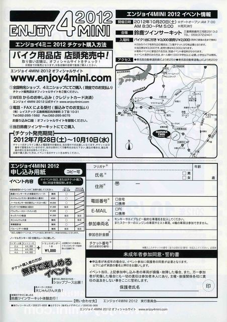 さぁ!今年も毎年恒例の日本最大級の4ミニイベント「エンジョイ4ミニ」が 開催されます!今年の夏の4ミニパラダイスに参加できなかったアナタ!ぜひ エンジョイ4ミニに参加してみませんか?また今年の4パラに参加された方で 「メーカーブースが少なくない?」と思ったアナタ!エンジョイ4ミニでは 4パラに参加しなかったメーカーも多数出展します(キタコ、デイトナ、オーバーなど) また、夏の4パラは暑くてちょっと・・・って方も秋の涼しい気候で4ミニワールド を楽しんじゃってください! 他にもサーキットの体験走行