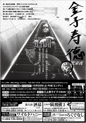 “唯一無比完全超個 荒野にひとりぼっちの甘えん坊 ひとりなのにひとりでいられぬ個の孤独 憑いては離れ離れてはひっつき是この孤独譚 繰り返す孤独と葛藤と暖求める心は時に沈み 時に他に向かい 心の真見つめ 心の向くまま 彼は走り 彼は助走をつけ、そして、彼は 羽ばたいてしまった もう還らない さよならは言わない”   〜天使か悪魔 知るは地獄か天国か?あなたが知らない金子寿徳 強力な磁場伴い 10月20日解禁!〜 【日時】2012年10月20日(土)open19:30 start20:00〜   【チケット予約/お問い合わせ】090-3857-4434 mail:machin