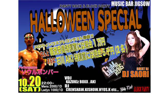 2012.10.20 (SAT) 場所:熊谷MUSIC BAR JIGSOW PANTY ROCK & BLOCK PARTY presents 『HALLOWEEN PARTY』 Entrance Fee Men's 2000/1D Lady's 1000/1D 仮装コンテスト開催!!!!!! 審査委員特別賞は賞金10000円 石川'AKI'特別賞は賞金5000円(2名) 大川賞(2名) GUEST DJ DJ.SAORI SPECIAL SHOWCASE ソウルボンバー VDJ KAZUKI'z BOXX AKI DJ CRENSHAW KISHOW NYOS K end more... きましたこの季節!!熊谷MUSIC BAR JIGSOWでもHALLOWEEN PARTYを開催です!! もちろん仮装コンテス
