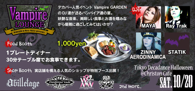 ★FLYER★ Model: NEW VAMPIRE FAMILY / DIVA SELIA / Mistress MAYA / ADRIEN Photo by Alexis / Design by Erikö http://createholic.jimdo.com/ デカバーの人気パーティーVAMPIRE GARDENのラウンジ版「VAMPIRE LOUNGE」がTokyo Decadance DX Halloween中に登場!!そして最後になります。 DecaBAR's popular event VAMPIRE GARDEN is taking a place at Tokyo Decadance's Gothic Floor as VAMPIRE LOUNGE and this will be the last one!! ★TOTAL INFORMATION★ http://midnightmess.com/index.php?id=12100001 Tokyo Decada