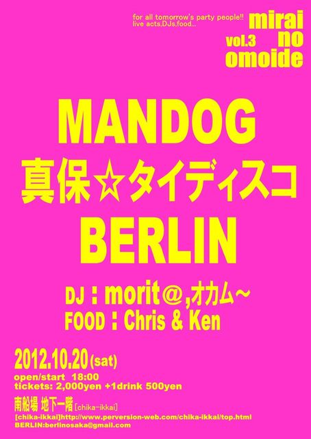 告知失礼致します。 最高な方々を呼んでます。ぜひ遊びに来てください!! よろしくお願いします。 ((((mirai no omoide)))) vol.3 ■10月20日(土)@南船場「地下一階」18:00〜   http://www.perversion-web.com/chika-ikkai/map.html ■MANDOG,真保☆タイディスコ,DJ:morit@,オカム〜,BERLIN ■FOOD:Chris&Ken ■DOOR:\2000(別途1drink)