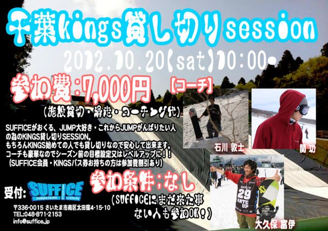 どーーもMAEです! 9月はイベントなかったのはこの企画を煮詰めてたから(言い訳。。 お待たせしました〜exclamation ×2 10月のイベントはKINGS貸し切りSESSIONでっすexclamation ×2 JUMP好きな方・今年のシーズンはカッコ良くJUMP飛びたいんだ!って人はもちろん。 行きたかったけど・・・ 新しい施設は・・ っで、ためらっていた方は貸し切り&SUFFICEユーザーしかいないので安心です。 (みんなで渡れば怖くない的な^^もちろん今回サファイスのイベント初参加の人もウェルカムですよ〜) そしてもちろんコーチもいます(≡^∇^≡) 今回のコーチは・・