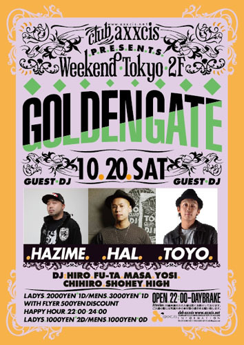 告知失礼致します。 10/20(土) @渋谷axxcis『GOLDENGATE』 ★★★★★★★★★★★★★★★ 『アローズのゲストでアクシス』 ★★★★★★★★★★★★★★★ でゲストディスカウントです☆ ※通常3000円かかってしまうところゲストで入場しますと↓↓↓ ※1時まで 男性1000/0D 女性1000/2D ※1時以降 男女1500/1D となっております。 何名様でも! 『アローズのゲストでアクシス』 でゲストディスカウントです☆