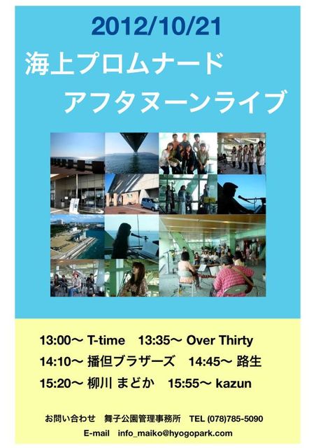 13:00〜T-time http://www.geocities.jp/akashiokkunn/index.htm 13:35〜Over Thirty http://livebarvoice.com/ 14:10〜播但ブラザーズ http://mixi.jp/show_friend.pl?id=12034660&_fof 14:45〜路生 http://rosei-net.com/ 15:20〜柳川まどか http://www.kobeamp.com/ 15:55〜kazun http://www.venus.dti.ne.jp/~kazun/ 舞子公園 ・明石海峡大橋8F 海上プロムナード特設ステージにて毎月第三日曜日13:00〜16:30に無料ライブを開催 (場合によって少し早めにスタートする場合もあります。リハはありません。☆出演者、および関係者スタ