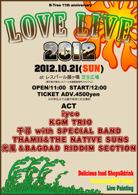 光風さん出演イベントのお知らせです。 B-Tree11周年イベントのお知らせです! 毎年恒例の周年イベントを今年も開催することとなりました☆ 皆様のお陰でSHOP設立11年目を迎える事が出来ます。 今回も昨年同様岡山空港に隣接するレスパール藤ヶ鳴の芝生広場にて行います。フード&アクセサリーショップの他今回はスノーボードメーカーの出店もありスノーボードギアが見れたり展示即売等もあります。ライブペイントも行いますよー☆音楽と食と雑貨とライブペイント&スノーボードカルチャーを加えたちょっとしたお祭り気分でお楽しみいただけれ
