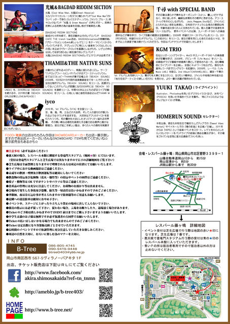 THAMIIさん出演イベントのお知らせです。 B-Tree11周年イベントのお知らせです! 毎年恒例の周年イベントを今年も開催することとなりました☆ 皆様のお陰でSHOP設立11年目を迎える事が出来ます。 今回も昨年同様岡山空港に隣接するレスパール藤ヶ鳴の芝生広場にて行います。フード&アクセサリーショップの他今回はスノーボードメーカーの出店もありスノーボードギアが見れたり展示即売等もあります。ライブペイントも行いますよー☆音楽と食と雑貨とライブペイント&スノーボードカルチャーを加えたちょっとしたお祭り気分でお楽しみいただけ