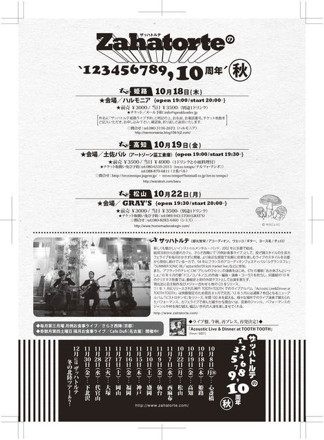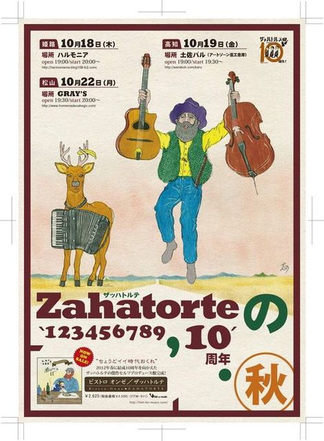 ザッハトルテが愛媛県に初めてやってきます。 バンド名にちなんでおいしいケーキ屋さんでの開催です♪ 50名限定ライブ。チケットはお早めに! 皆さん是非おいでくださいね。 ♪♪♪♪♪♪♪♪♪♪♪♪♪♪♪♪♪♪ 10月22日(月) 愛媛県松山市千舟町4-6-2 GRAY'S 19時30分開場 20時開演 チケット代 3,000円(ドリンク別) チケット問い合わせ・電話予約 GRAY'S 089-943-5700 シミズ 090-8283-4460 もしくはmixiのメッセージでも承ります☆ ♪♪♪♪♪♪♪♪♪♪♪♪♪♪♪♪♪♪