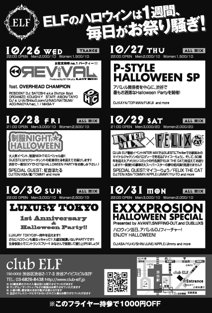 Halloween Week 【10/26〜10/31】 ハロウィンウィークは仮装のお客様に限り入場無料となります。 10/26 WED (TRANCE) 【REViVAL】-Halloween night- GUEST DJ:Over Head Champion RESIDENT DJ:SATOSHI(Glutton Boyz) 10/27 THU (J-POP) 【P-STYLE】 RESIDENT MC:PIROMU GUEST MC:FUKUI@PYLON/TOP-MAN SOUND PRODUCED BY DJ KAYA 10/28 FRI (ALL MIX) 【制服NIGHT☆HALLOWEEN】 GUEST:紅音ほたる PRODECED BY 嵐(あいのり) 10/29 SAT (ALL MIX) 【INTER MIX feat.FELIX】 SPECIAL GUEST:FELIX THE CAT/マイコーりょう