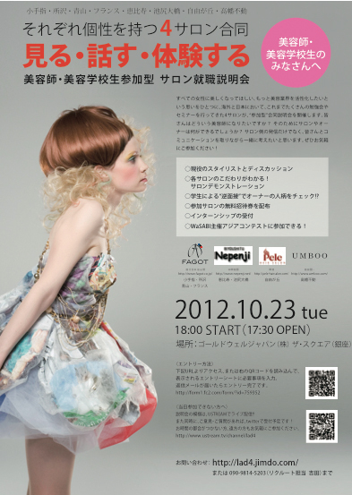 <まだ内定をもらっていない美容学生・転職活動中の美容師の皆様へ> ☆『海外』での活動や、『ヘアメイク』に興味のある美容学生・美容師さんも是非ご参加ください! ☆青山・恵比寿・池尻大橋・高幡不動・所沢・小手指に店舗を持つサロンが参加します。 合同サロン就職説明会『LAD』(JP 4 Salons Recruit Live!) 美容学校生・美容師のみなさん。 10月も半分を過ぎましたが、まだ思い通りのサロンが見つからず焦っていたり、すでにやる気がなくなっていたりしませんか? 『新卒の7割が半年で辞める』 『平均の勤続年数が1.8年』