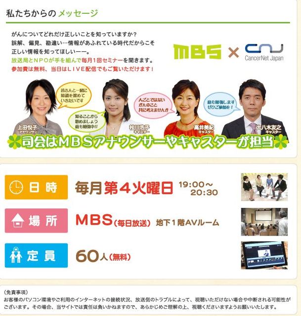 速報:10月23日(火)もっと知ってほしい「乳がん」のこと 夜7時〜8時半放送! 関西の放送局・MBSとNPO法人CNJ(キャンサー・ネット・ジャパン)が 各種のガンについてのセミナーを毎月開催しており、 その様子はUstreamでインターネット同時配信されます。 http://www.cancernet.jp/mbscnj/index.html ★MBS×キャンサーネットジャパンのコラボ企画です。 今月はピンクリボン月間・乳がんの企画です。 視聴するにあたって、参加費や会員登録は不要です。 よかったらご覧ください。