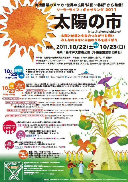有機農業のメッカ・世界の玄関“成田〜北総”から発信する 太陽の市 太陽と地球と生命のつながりを祝い みんなの未来に平和のタネを蒔く祭り 太陽の市開催にむけて 千葉県の成田〜北総地域は、有機農業が大変盛んな地域です。 たくさんの有機農家が、色々な農法を駆使し、バリエーション豊かな野菜を育てています。 今まで、地域を通り越し、都心の一部の通によって消費されてきた、北総の有機野菜ですが、 この秋、地元の皆さんに、秋の味覚を,心底堪能し、地元の良さを堪能していただくために、 日本最大規